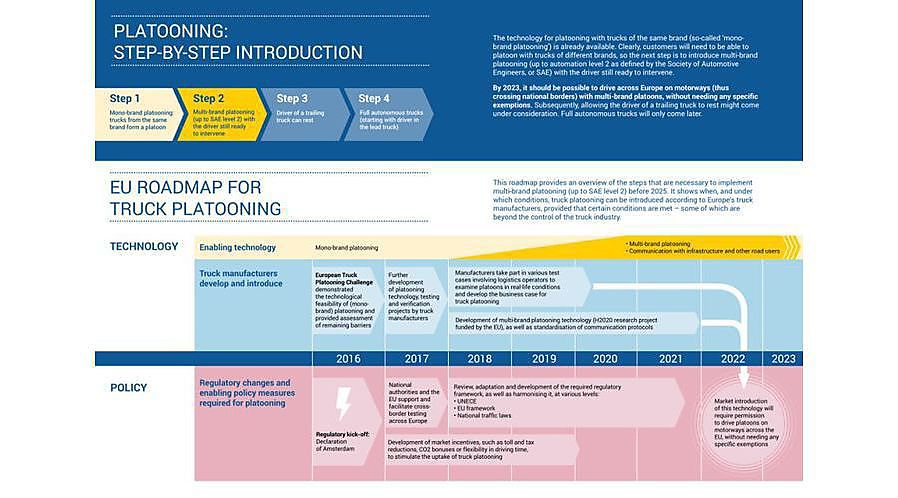 Onlangs onthulden Europese vrachtwagenfabrikanten een stappenplan dat leidt naar de introductie van semiautomatische trucks op de Europese autosnelwegen voor 2025. Naast de timing bepaalde men ook richtlijnen voor beleidsmakers over de wijzigingen in de regelgeving die nodig zijn voor grensoverschrijdende truck platooning. Truck platooning houdt in dat twee of meer vrachtwagens als konvooi rijden met behulp van connectiviteitstechnologieën. De eerste truck fungeert als leider terwijl de andere vrachtwagens reageren op zijn bewegingen, waardoor weinig tot geen actie nodig is van de bestuurder. Door deze techniek kunnen vrachtwagens dichter na elkaar rijden waardoor de luchtweerstand van de vrachtwagens, en bijgevolg ook het brandstofverbruik en CO2-uitstoot, geminimaliseerd wordt. Dankzij het automatische en onmiddellijke remsysteem bevordert truck platooning ook de veiligheid. Daarnaast worden de goederen sneller geleverd en zouden de files in aantal minderen. Tegen 2023 zou het mogelijk moeten zijn om over de Europese snelwegen te rijden met truck platoons zonder specifieke vrijstellingen nodig te hebben voor het overschrijden van nationale grenzen – een voorwaarde voor internationaal transport. Maar voordat truck platooning realiteit kan worden, zal Europa een overkoepelende regelgeving moeten creëren. Nieuwe regels moeten ontworpen worden, bestaande aangepast en internationale en EU-regels moeten geharmoniseerd worden.