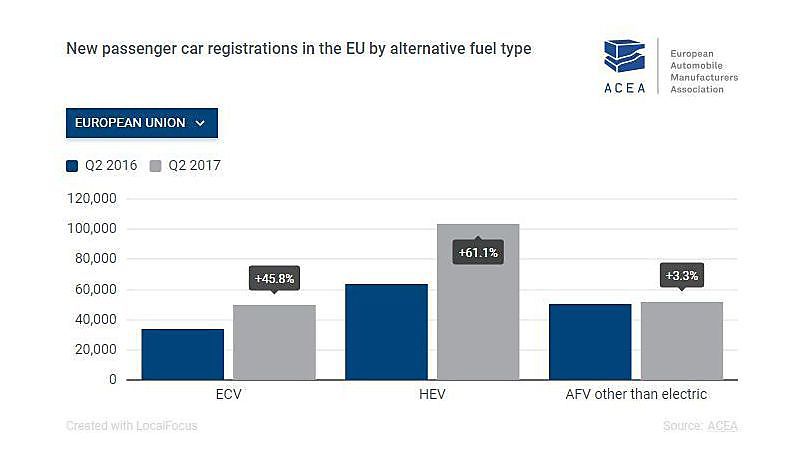 In het tweede kwartaal van 2017 zien we dat de vraag naar voertuigen met alternatieve brandstoffen het positieve verloop van het eerste kwartaal volgt. Het aantal geregistreerde voertuigen steeg met 38% vergeleken met dezelfde periode in 2016. In de EU werden 204.502 auto’s met alternatieve aandrijflijnen geregistreerd. Deze voertuigen maken ongeveer 5,1% uit van alle verkochte personenvoertuigen in het tweede kwartaal van 2017. Ook hybride en elektrische wagens kenden een stijging in aantal registraties (respectievelijk +61,1% en +45,8%). De groei in elektrische wagens werd ondersteund door een significante groei in de vraag naar elektrische wagens op batterijen (+49,7%) en plug-in elektrische auto’s (+42,3%). Het aantal geregistreerde nieuwe auto’s aangedreven door propaan of natuurlijk gas steeg in het tweede kwartaal ook met 3,3% als resultaat van de populariteit van LPG-wagens (+23,7%). Deze positieve trends op de Europese markt zijn te zien in de vijf grote markten: Duitsland (+91,9%), Spanje (+80,7%), Frankrijk (+28,6%), het Verenigd Koninkrijk (+24,4%) en Italië (+18,1%). De groei in de meeste landen is vooral toe te schrijven aan de populariteit van hybride-elektrische en elektrische auto’s. De Italiaanse markt doet het vooral goed in het segment van de LPG.