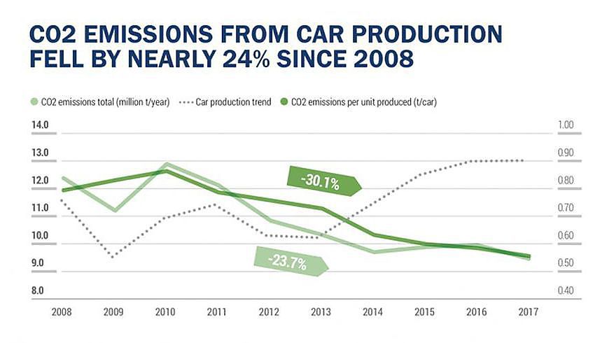 De meest recente gegevens van de Europese Federatie van Automobielfabrikanten (ACEA) tonen aan dat autofabrikanten de milieueffecten van de autoproductie in het afgelopen decennium aanzienlijk hebben verminderd, hoewel het aantal geproduceerde auto's is toegenomen van 11,9 miljoen in 2013 tot 17 miljoen in 2017. Dit is belangrijk, aangezien de fabrikanten erin zijn geslaagd om de CO2-uitstoot los te koppelen van de productiegroei. Bovendien is het waterverbruik van elke auto die de afgelopen tien jaar is geproduceerd, met ongeveer 31 procent gedaald. Dit werd met name bereikt door gebruik te maken van recirculatietechnologieën voor het hergebruik van water en andere langetermijnstrategieën om het waterverbruik te beperken. Desondanks is het energieverbruik per geproduceerde auto de afgelopen 10 jaar met bijna 16% gedaald. De hoeveelheid afval die per geproduceerde auto werd geproduceerd, nam in dezelfde periode met bijna 14% af. "Deze positieve staat van dienst toont aan dat de auto-industrie zich sterk inzet om de milieu-impact van zowel het gebruik van haar voertuigen als de productieprocessen te verminderen. Het maakt deel uit van een permanente en veelzijdige strategie waaraan alle Europese fabrikanten zich houden.” Aldus Erik Jonnaert, secretaris-generaal van de ACEA.